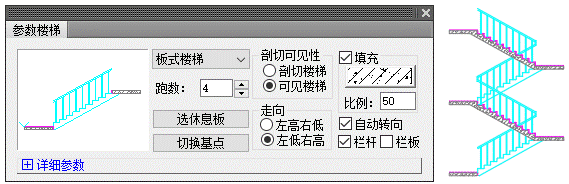 除自動生成立剖面以外,程序還提供有獨立的立剖面繪制編輯工具,如繪制剖面參數樓梯。