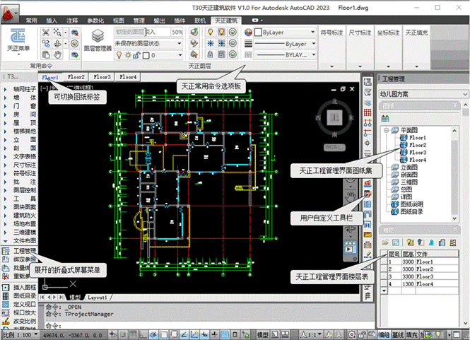 天正建筑引入了工程管理概念,工程管理器將圖紙集和樓層表合二為一,將與整個工程相關的建筑立剖面、三維組合、門窗表、圖紙目錄等功能完全整合在一起,同時進行工程圖檔的管理,無論是在工程管理器的圖紙集中還是在樓層表雙擊文件圖標都可以直接打開圖形文件。