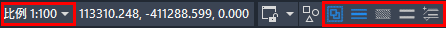 狀態欄的比例控件可設置當前比例和修改對象比例,提供了編組、墻基線顯示、加粗、填充和動態標注 (對標高和坐標有效) 控制。